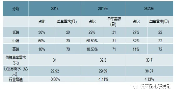 1,且有高端车型销售占比提升的趋势,此外叠加汽车电子化带来单车需求量年均增长1只,简单估算目前低端车型单车需20只,中端30只,高端70只,低端车型占比每年降低2%,则单车需求量每年提升2-3只,叠加汽车行业有望企稳,预计若2020年全球汽车销售量保持平稳的情况下,汽车继电器行业增速在2020年重回正增长。