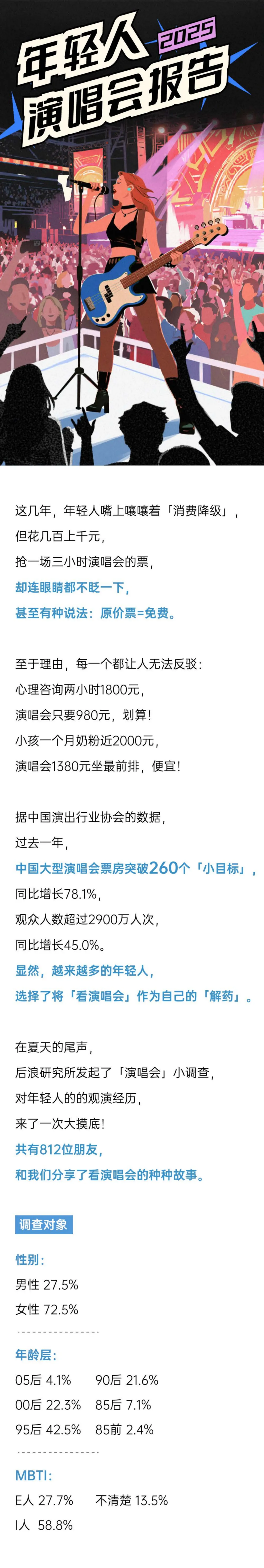 近日,后浪研究所发布《2025年轻人演唱会消费趋势报告》。报告基于 812 份调研样本,聚焦年轻人演唱会消费习惯、动机偏好与场景特征,揭示 “情绪驱动、理性消费、社交属性凸显” 的核心趋势,为演出行业从业者提供精准参考。