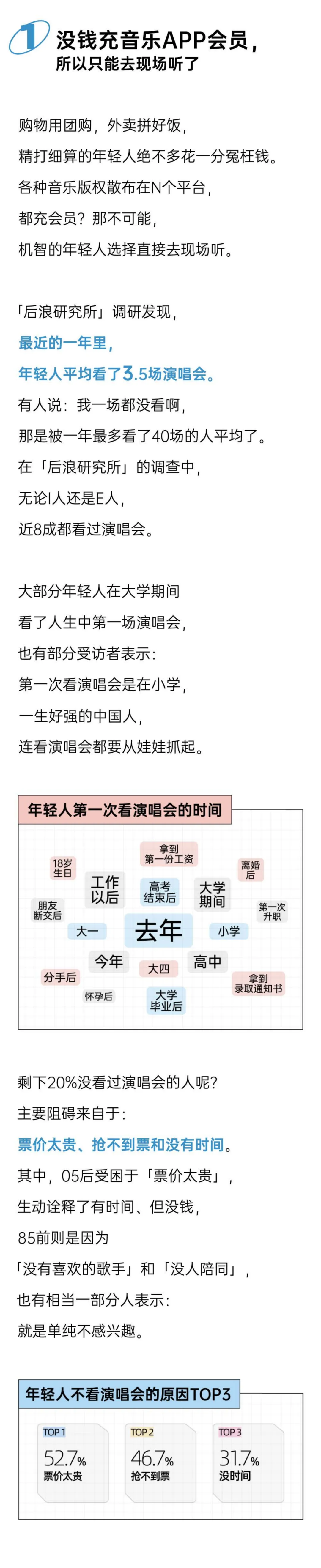 从参与度看,近 8 成年轻人看过演唱会,过去一年平均观看 3.5 场,95 后占比 42.5% 成为主力,女性(72.5%)参与度显著高于男性(27.5%);58.8% 的 I 人和 27.7% 的 E 人都是演唱会常客,大学期间是多数人首次观演的时间节点。