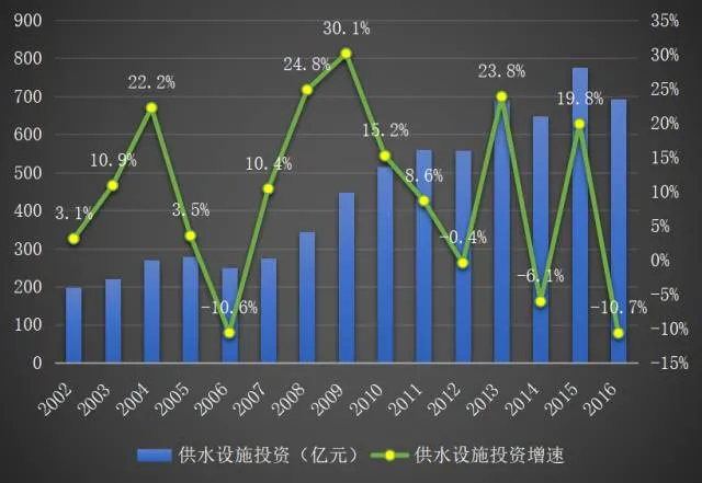 全国供水设施建设固定资产投资从2002年的199亿元增长到2016年的694亿元。“十一五”期间供水设施投资得到快速增长,近几年增长速度有所波动,但总量基本稳定在700亿元左右,从大趋势来看,我国供水设施建设已趋近饱和,进入平稳发展状态。