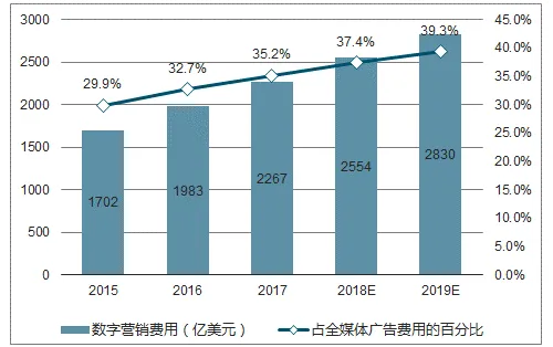 2015-2019年全球数字营销费用自1702亿美元增长至2830亿美元,年均复合增长率达到13.6%。同时,数字营销费用占全媒体广告费用比重也在不断提升,预计2019年将达到40%。据预测,数字营销市场规模持续扩大,2020年将达5208亿元,其中移动营销投放占数字营销主要投放份额。