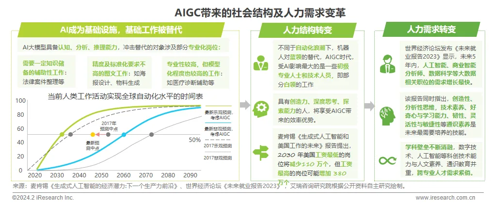 技术的跃迁、生产效率的提升并不会自然带来社会整体福利水平的提升,相反往往以牺牲部分人的利益为前提,进而引发社会结构、人力需求的重塑。AIGC交互界面的用户友好性、大模型开源及API价格的降低、插件服务带来的应用生态繁荣等,都使得AI技术或将成为像水、电、网络一样的基础设施,渗透并改变千行万业。然而,大模型具有认知、分析、推理能力,不同于自动化浪潮下对蓝领的冲击,AIGC时代受AI影响最大的可能是初级专业人士和技术人员,即部分白领。据Challenger报告显示,2023年5月,美国因AI替代造成的失业人数达3900人,且都发生在科技行业。以及据麦肯锡数据预测,到2045年左右,有50%的工作将被AI替代,比此前的估计加速了10年。与此同时,具有创造力、深度思考等高阶智力的人才,将享受到AIGC带来的效率优势,成为AI的驾驭者,相应的工作需求也会增加,并同时在教育领域创造出大量专业和学科,对教育课程和专业设置、人才素养评价提出新要求。据世界经济论坛发布的《未来就业报告2023》显示,未来5年内,人工智能、商业智能分析师、数据科学等大数据相关职位的需求增长最快,且创造性思维、技术素养、好奇心和学习能力等通识素养是未来最需要培养的技能。智能时代背景下,传统的技能已无法满足社会需求,学科壁垒不断消融,跨专业人才需求紧俏。