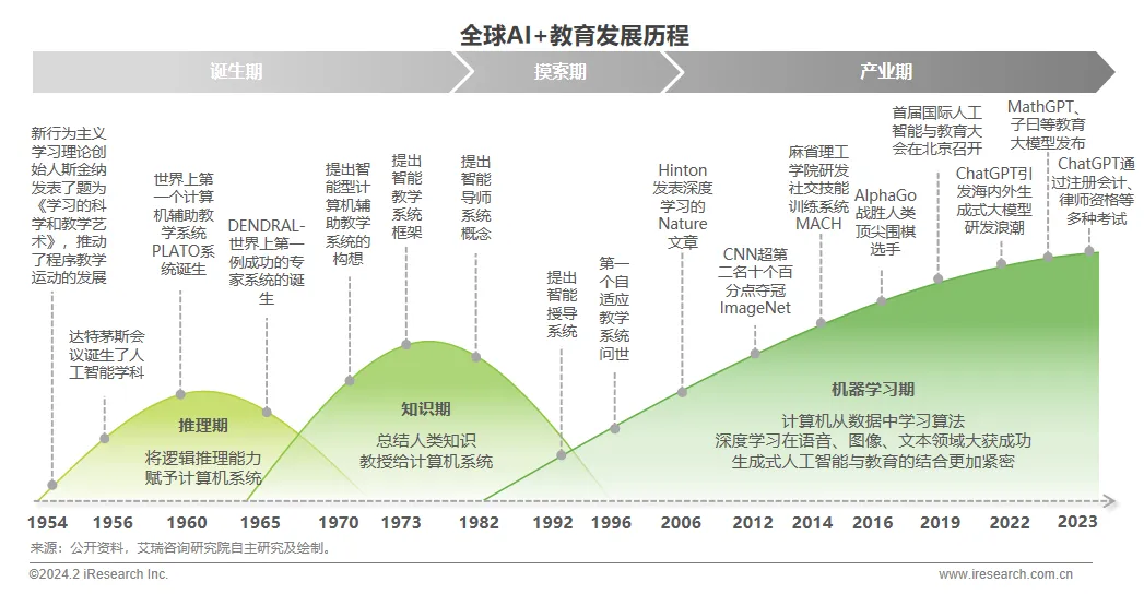 全球AI+教育经历了诞生期-摸索期-产业期三个阶段,在诞生期,AI和教育的结合主要围绕辅助教学进行探索,应用于答疑、练习、模拟测试等环节,代替部分教师的重复性劳动。在机器学习的兴起下,AI+教育进入摸索期,二者结合的探索主题为智能导学及自适应学习。随着深度学习技术的进步,人工智能技术步入商业化阶段,AI+教育也进入产业期。近几年大数据、云计算、算力能力提升,大规模语言模型急速发展,2022年ChatGPT的发布更是引发了海内外LLMs的军备竞赛,2023年各类教育垂类大模型的争相发布,打开了通向通用人工智能(AGI)之路,帮助师生大幅提升教学效率,推动大规模的因材施教逐步落地。