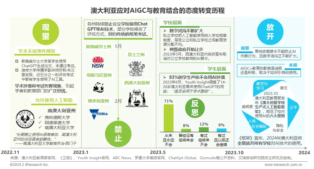ChatGPT自发布后很快受到学生们的欢迎,但随之出现的学术舞弊现象引发学者和教育部门的广泛担忧。经过短暂的观望期,美国、英国、澳大利亚等地区纷纷禁止公立学校使用人工智能工具,我国的香港大学也颁布了针对ChatGPT的禁令。但一纸禁令不能杜绝作弊现象,由此扩大的数字鸿沟也引起重视。对待新兴技术的最佳态度是“堵不如疏”,正确的引导与使用能够弱化AIGC与教育结合带来的冲击,在抓住变革机遇的同时守正创新。当前,美国、英国及香港大学已先后撤销了禁令,澳大利亚也发布《框架》以规范和引导校内人工智能的使用。