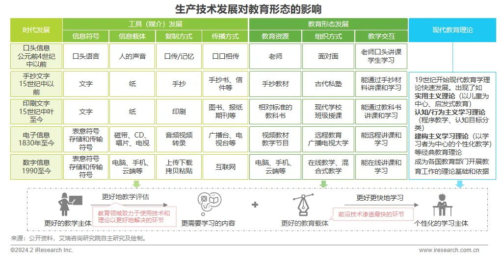 教育作为服务于人类群体传承的古老环节,其连续性、稳定性和继承性的本质特征,决定了它不会随着生产技术发展而快速进化。在传统教育模式的基础上,前沿生产技术主要带来了教育资源类型、教学组织方式以及教学交互方式方面的革新,其影响是累积、叠加和渐变的,而并非是全然替代性的,“老师讲授-学生吸纳-知识传承”的班级授课至今仍然是学校的主流教学模式,和千百年前并没有本质上的区别。而如何利用前沿科学技术结合现代教育理论,实现更大规模、更高质量、更高效率以及更好成果的教育,是当代教育研究领域一直致力于探索的问题。