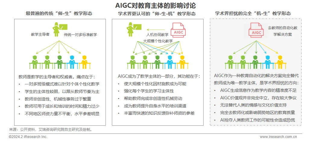 AIGC技术在教育领域引发变革的讨论中,对教学主体的影响是个引人注目的话题。在传统的师生教学模式中,教师是权威的知识传递者,但这一模式面临师资力量不均、个性化教学难度大以及教师机械劳动繁重难以成长等现有问题和弊病。AIGC技术的介入被看作是一种契机,代表了传统教学形态向“师-生-机”模式转型的可能性。AIGC能够通过补充教师资源、实现大规模个性化教学和减轻教师负担等功能,加大了实现更好教学的可能性,从而被学术界和市场普遍认可,同时人类教师可以从传统的知识传播者向学习的陪伴者和价值观的引导者方向转变。然而对“AI完全替代人类教师”担忧之声也同时存在,当前AIGC价值观的非中立性、信息准确性的不足、版权问题以及无法复制的人类情感和文化价值等问题使其难以独当一面,另外AI完全抢夺人类教师工作的可能性也会引发教师就业的恐慌。正反两方面的讨论,说明AIGC对教师的支持应用需要慎重框定范畴,以确保其成为教育主体的助力而非障碍。