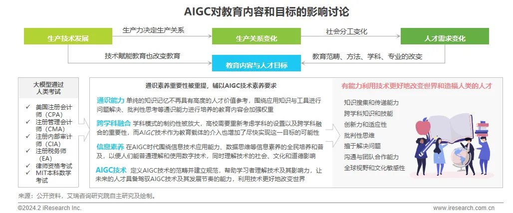 新一代AI技术在显著提升社会生产力的同时,也引发了生产关系的变革,社会分工结构面临重组,一些传统岗位被AI取代,新兴职业快速出现,而部分旧有学科则逐步淘汰。AIGC时代给教育系统带来了一个庞大而艰难的研究课题:我们应该如何培养能够适应这一变革的有用人才?这不仅涉及到教育范畴、目标和内容的调整,还包括学科专业设置的改变。2023年3月发布的《普通高等教育学科专业设置调整优化改革方案》进一步明确了到2025年将新设一系列适应新技术、新产业、新业态、新模式的学科专业,同时淘汰那些不再适应经济社会发展需求的学科专业。同时,ChatGPT等大模型先后通过注册会计、律师资格等多种考试,在信息搜集和整合上的能力逐渐接近甚至超越人类,也让我们反思AIGC时代下,简单的专业知识教学的社会适应性。因此教育系统需要调整教育内容,重视信息素养和高阶通识能力的培养,逐渐增加跨学科融合式教育的权重,以加快前沿人才的供给速度。同时,教育系统还需要尽快明确围绕AIGC技术学习的范畴和规范,帮助学习者接受并适应AIGC时代的到来,并理解技术及其对世界的广泛影响,这将确保未来的技术人才能够驾驭技术走向及其发展节奏,并有能力利用AIGC技术更好地改变世界和造福人类。