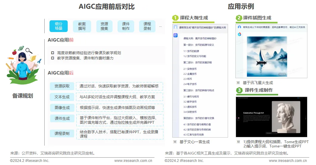 备课是一个兼具较大工作量和创造力需求的工作。工作量主要体现在不同学段、不同班级的课程大纲、教案的撰写、课程资源的搜集,以及课件的制作方面,创造力需求主要体现在根据各班级学情、进度的不同进行个性化修改和调整,以及师生互动设计等方面。AIGC技术的应用,使得教学资源搜集、课件制作等偏执行的工作在大数据驱动下,可以更加快速高效地完成,节省教师大量时间。由此,教师可以从事更多如师生沟通、学生关怀、互动设计等创造性、情感性、社交性的工作。