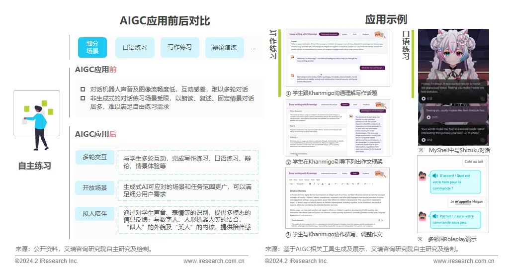 在判别式AI技术下,学生在口语练习时常常存在对话简单、场景受限、难以多轮交互、个性化不足等问题。AIGC技术应用后,大模型参数的扩大、预训练架构的使用等,使得原本单向播报和简单问答的功能进一步拓展了多轮对话、逻辑推理、上下文理解能力。其次,基于新数据生成而非识别分类的逻辑,AIGC产品可应对的场景和任务范围更加广泛,可以满足用户对细分场景的需求。同时,与数字人、人形机器人结合后,多模态的大模型既可识别学生的声音、表情等特征,也可借助“似人”的外貌提供“类人”的交互陪伴。从不同细分场景的成熟度来看,当前口语、写作练习等,相较于数学、化学等逻辑类的练习任务,用户容错能力更强,应用成熟度和热度也更高。