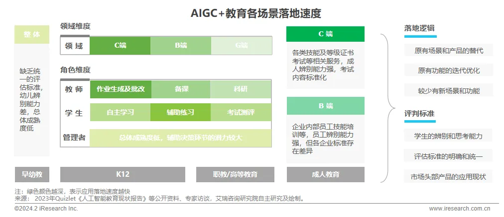 就落地速度而言,创新技术的落地通常需要一个应用扩散的过程,尤其是对于教育这个古老的行业。根据创新扩散理论,最先尝试新技术的往往是部分技术爱好者和先驱,C端具有明显的长尾效应,而B端和G端属于集体和组织行动逻辑,灵活性较低,且G端传统惯性较强,往往相对滞后。同时,在技术应用初期尚不成熟时,则需要配套设施的辅助落地。如果把AIGC技术看作教学资源的话,则需要教学对象和评估标准的配合,学生辨别和思考能力越强,教学内容的评估标准越明确和统一,则技术落地的可能性越强。具体来看,由于成人的辨别能力强,评估标准相对明确,所以成人教育整体的落地速度更快。从使用者的视角来看,Quizlet的调研报告指出,使用过ChatGPT等AI技术的教师(占比65%)比学生多(占比61%),教师的应用需求更迫切,落地更快。同时,尽管AIGC技术应用对教学管理的影响重大,如对学情趋势的预测、管理决策的辅助等,但管理侧总体落地进程缓慢。
