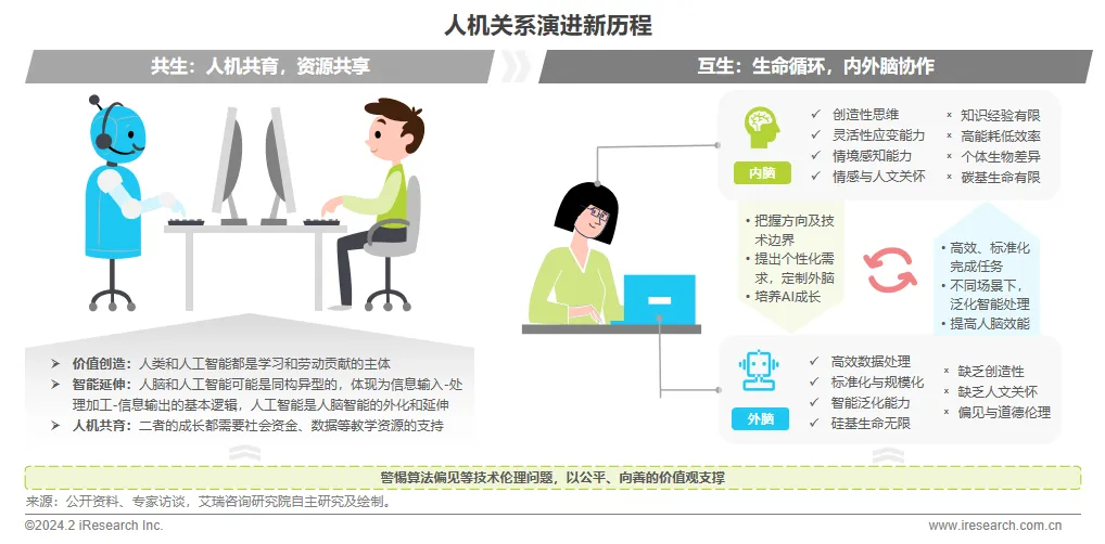 一种技术的长处,将导致一种新文明的诞生。AIGC技术在巨量数据的加持下,在发现、认识、运用规律上相比于人脑有着明显的优势,在劳动贡献、价值创造中逐渐与人比肩甚至超越人类,推动人机关系由“共生”走向“互生”。在“共生”层面,体现为人机共育和资源共享。人类和人工智能同样是学习和贡献的主体,人工智能是人脑智能的外化和延伸,在内在逻辑上有一定的相似性,二者的成长都需要大量的社会资金及数据资源支持。在“互生”层面,AIGC技术可视为人的“外脑”,与“内脑”各有功能定位并相互协作。内脑因其创造性、灵活性等,需把握人机协作方向及技术边界,同时可基于个性化需求定制外脑,并培养AI成长;外脑可高效、标准化地完成大量任务,同时在不同场景下有着泛化处理能力,可显著提高人脑效能。在漫长的文明演进过程中,人类与AI将一起永无止境地学习、构建。
