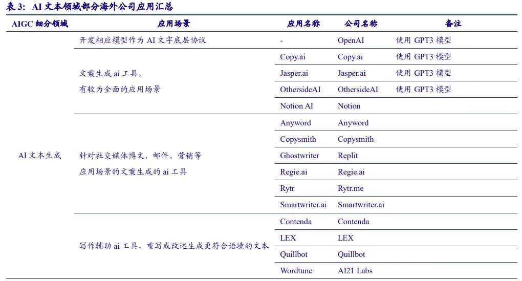 《ChatGPT开启AI新纪元,AIGC投资框架梳理》由中国银河证券于2月17日发布,报告内容同样是以ChatGPT的爆火为基础,同时分析了ChatGPT对AIGC领域的影响,其中包括AIGC海外公司布局梳理,比如AI文本生成细分领域除了OpenAI之外,还有包括Copy.ai、Jasper.ai在内的14家公司。