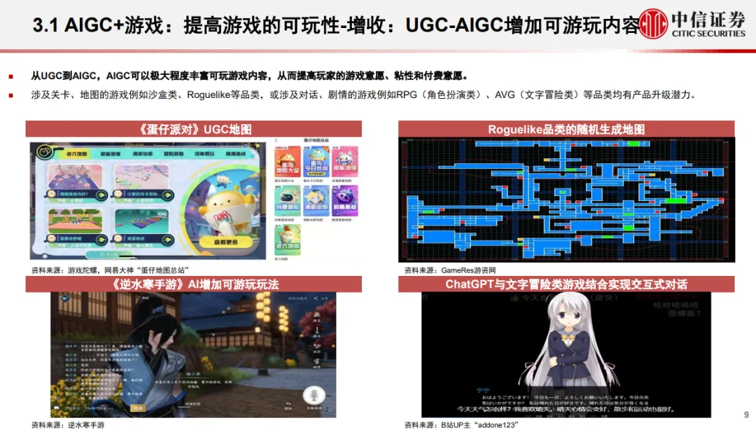 中信证券发布的《AIGC如何赋能文娱行业》是传媒互联网行业前沿科技专题系列报告之一,报告认为游戏、内容、文旅等文娱板块将是有望率先实现AIGC落地的行业之一。针对游戏方面,报告提到AIGC可以提高游戏的可玩性,另外还能提高报告的生产效率,通过AI辅助程序化和工业化人物场景美术和建模等,降低游戏研发成本。