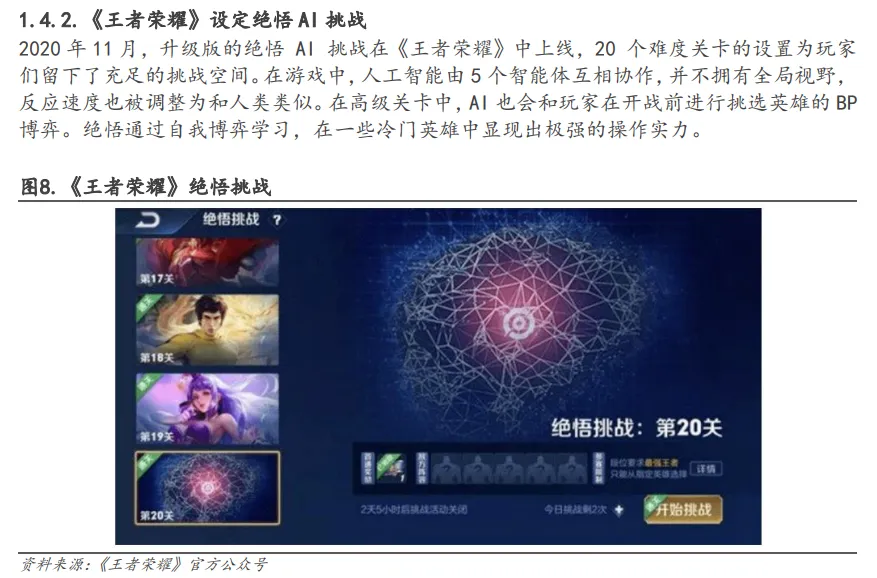 安信证券发布的《AIGC将开启新一轮游戏产业变革-从“上网”到“上算”,由“网络世界”至“虚拟现实》是AI专题系列报告之一。报告核心观点为AIGC将开启新一轮游戏产业变革,同时报告还对AI技术在游戏行业中的实际应用案例做了汇总,其中包括《逆水寒》手游中的智能NPC、原神研发过程中的AI系统、《王者荣耀》设定绝悟AI挑战。