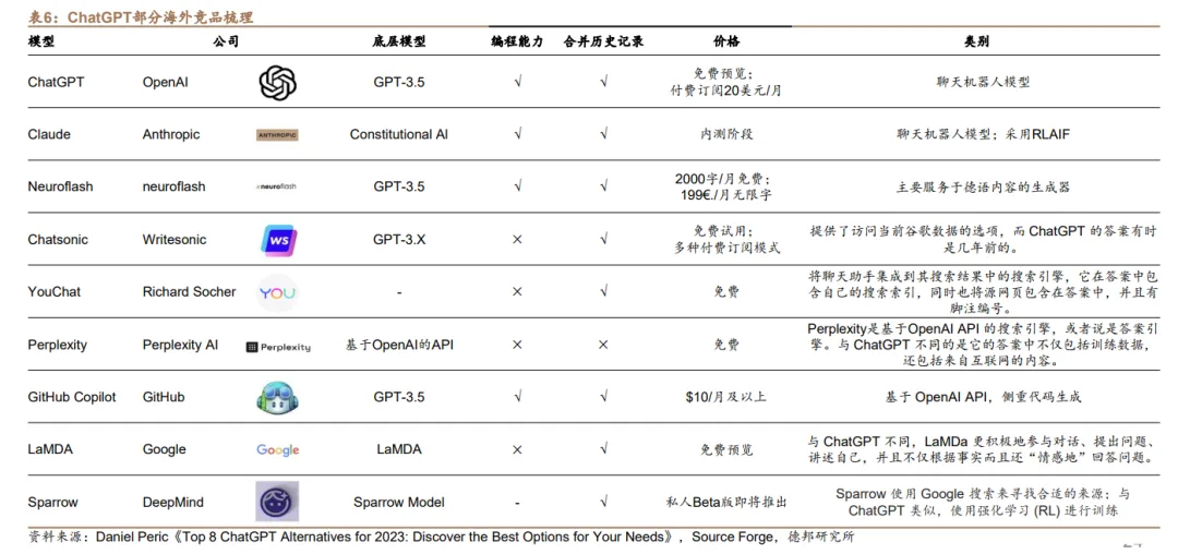 《ChatGPT更懂人类的叙事》由德邦证券于2月14日发布,报告首先对ChatGPT进行简单概述,同时对ChatGPT的核心优势以及技术应用场景进行简单概述,另外报告还对ChatGPT其他类似产品做了整理汇总,其中包括YouChat、LaMDA、Sparrow等各种类似软件。