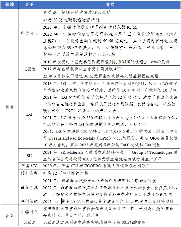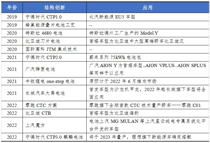 2019年可以说是动力电池结构创新元年,各动力电池企业以及各大车企积极探索动力电池结构创新,推出各类去模组化、集成化的电池结构创新技术,并在新能源汽车市场逐步予以应用。当前,电池包模块化、标准化程度不断加深,整个电池包的生产环节集中度继续提升为大势所趋,以宁德时代、比亚迪为代表的动力电池企业以及以特斯拉为代表的各大新能源汽车车企对动力电池结构的进一步革新引领着整个电池行业的发展。CTP(Cell To Pack,无模组动力电池包)是宁德时代主推的电池结构集成技术,其发展大体可以划分为3个阶段,分别为CTP1.0、CTP2.0和CTP3.0。2022年6月23日,宁德时代首次公开发布麒麟电池(CTP3.0),开创结构创新之路。通过第三代CTP技术革新,麒麟电池成为全球集成度最高的电池,体积空间利用率最高可达72%,同时可将三元电池系统能量密度提升至255Wh/kg,磷酸铁锂电池系统能量密度提升至160Wh/kg,量产后整车续航可实现1000km以上。此外,在安全性、电池寿命以及快充性能等方面也得到了进一步提升。由于推出时间较短,目前在市场上还未有实际应用,预计将于2023年量产,理想汽车旗下新能源车已确定搭载。2020年9月23日,特斯拉推出4680电池,是特斯拉继18650电池、21700电池之后推出的第三代电池,相较于21700电池,4680能量方面提高5倍、续航里程提高16%、动力方面提高6倍、成本方面降低14%;冷却方面,特斯拉采用蛇形冷却板贴附设计,而且内部散热鳍片自成回路,无需串联,整体来看散热能力优异。2022年1月特斯拉生产了100万块4680电池,意味着放量在即。目前,特斯拉拥有CTC技术、4680电池以及一体式压铸三大前沿技术,在新能源汽车领域是一面旗帜,引领电池结构创新。此外,比亚迪着重从安全和续航出发,2020年3月推出比亚迪刀片电池,其技术逻辑为将单体电池通过阵列的方式排布在一起,就像“刀片”一样插入到电池包里面,在成组时跳过模组和梁,减少了冗余零部件,形成类似蜂窝铝板的结构,从而大幅提升集成效率,空间利用率提升至60%,该技术在电池安全、强度、续航、耐低温、寿命、功率、成本以及快充性能等方面有着显著优势。目前,比亚迪研发团队大力推进刀片电池的研发,计划推出第二代刀片电池,最快将于2022年推出,性能提升将主要体现在温控能力和能量密度提升方面,其中能量密度或可达180Wh/kg。目前大部分动力电池的技术创新以结构创新为主。比亚迪刀片电池,从本质来讲是磷酸铁锂电池的一种,通过对电芯外形、布局排列的重新设计以及生产工艺的改进使刀片电池容量大幅提升。特斯拉4680大圆柱电池采用无极耳以及CTC技术,将电芯直接集成到底盘,为车辆减重10%,增加14%续航里程。宁德时代发布的第三代CTP技术-麒麟电池本质仍属于三元锂/磷酸铁锂电池,CTP被称为无模组电池包,由于取消了包裹在电芯外的模组,电池包有了更多空间排列电芯,系统能量密度得以增加,从而提高电池的续航里程。此外,诸如国轩高科JTM集成技术、广汽弹匣电池、中航锂电one-stop电池、长城汽车大禹电池、零跑CTC方案、上汽魔方及蜂巢能源叠片电池工艺都是着力在电池结构领域进行的创新。除了结构创新之外,目前动力电池技术也有在材料上创新。除了全固态电池还需要若干年的努力才能实现商业化量产之外,从材料上看,高镍电池、无钴电池、无镍无钴电池等已经相继开始研发或发布。结构创新与材料迭代持续构筑中国电池企业竞争力;第一轮电池供应链重组受益于软包式微、方型崛起,磷酸铁锂、高电压三元、CTP等加成下宁德时代快速突破欧洲市场,未来三年市占率有望不断创新高;第二轮重组中新的电池结构(如大圆柱、麒麟电池)及材料体系(超高镍、磷酸锰铁锂)将成为重要创新,提升中国电池企业获取全球车企订单的竞争力。21年开始电池企业加大上游资源端布局力度,据不完全统计,近年相关投资近20起,包括宁德时代布局四川锂辉石矿和宜春锂云母矿,比亚迪参股扎布耶盐湖、投资建设盐湖产能。随着22年下半年和23年开始相关布局的陆续贡献,预计拥有资源布局的锂电池企业后续成本优势将进一步凸显。此外,国内头部厂商在布局上游材料资源的同时也把目光投向了上游设备企业,其中宁德时代投资入股了4家企业,包括先导智能、利元亨等设备龙头企业,以满足其对生产设备的需求供应。随着欧洲等海外市场需求的快速提升,海外市场对于动力电池厂商具有极大的吸引力。根据欧洲汽车制造商协会数据,2021年欧洲30国实现新能源乘用车注册量226.3万辆,同比增长65.7%,电动化率从2020年的11.5%提至19.2%。美国汽车创新联盟数据则显示,2021年美国新能源轻型车实现销量71.6万辆,同比增长124.6%,电动化率从2020年的2.2%提至4.8%。出海已经成为国内电池企业的一致选择。目前,宁德时代、国轩高科、亿纬锂能、蜂巢能源、孚能科技等多家电池厂商均已启动海外建厂,此外如中创新航、欣旺达等也已经明确海外扩张计划。相比之下,在海外扩张方面,LG新能源、三星SDI、SKI、松下等日韩企业已早早地走在了前面,尤其是在全球经济的重要区域——欧洲和北美,都已拥有多座电池工厂。随着锂价格的暴涨,电池企业成本高企,利润下滑,材料替代逐渐成为了行业变革研究的方向,加之锂电资源在全球处于比较稀缺的状态,在这个时候钠离子电池重新进入厂商的视野。相比于锂电池,