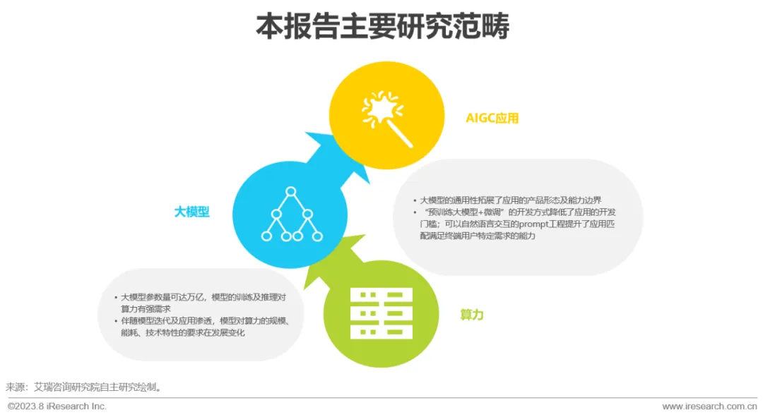 AIGC(AI-Generated Content)指利用人工智能技术(生成式AI路径)来生成内容的新型内容生产方式。2022年11月上线的AIGC应用ChatGPT,凭借其在语义理解、文本创作、代码编写、逻辑推理、知识问答等领域的卓越表现,以及自然语言对话的低门槛交互方式,迅速获得大量用户,于23年1月突破1亿月活,打破前消费级应用的增速记录。微软称其在GPT-4(ChatGPT Plus背后运行的大模型)中看到了AGI(通用人工智能)的雏形。大众的生活工作日常出现了Midjourney等新形态的各类AIGC应用,各行业的智能化升级也看到了新的可能性,“AI产业”与“产业AI”的想象空间进一步拓展。AIGC应用创新的技术支撑为“生成对抗网络(GAN)/扩散模型(Diffusion)”与“Transformer预训练大模型”的两类大模型分支。在国外AIGC应用展示出大模型的能量的同时,我国企业也加强了相关产品技术布局,云厂商、AI大厂、创企、各行业公司及技术服务商等产业各领域玩家纷纷发布大模型或基于大模型的应用产品及各类技术服务。相较于一般AI应用,大模型应用的训练及推理需要更强的算力支持。综上,本报告将围绕模型、应用、算力三个角度对AIGC产业的发展进行探讨,试图在讨论开源闭源、垂直通用、知识幻觉等大模型未来发展的各种不确定性的同时,为AIGC应用的迭代升级、产业的智能化应用,提供尽可能多的研究辅助,为那个不一定是AGI但一定更AI的未来提供确定性的加速度。