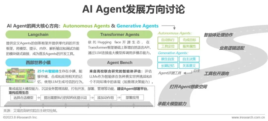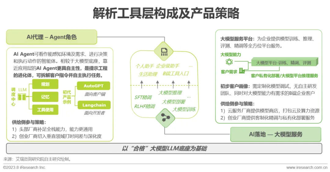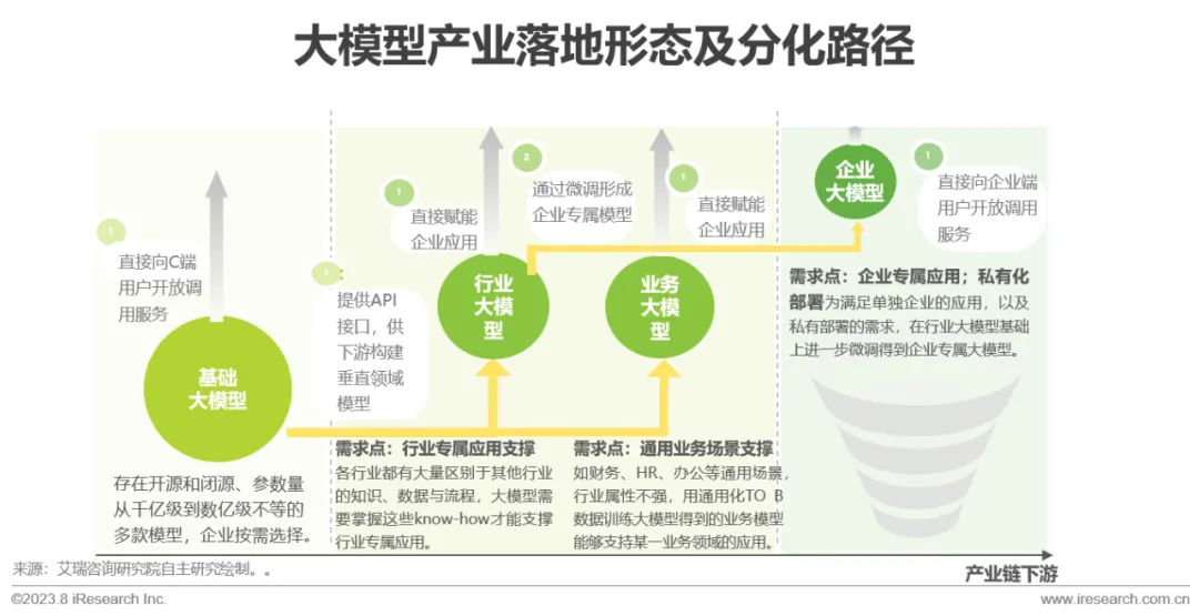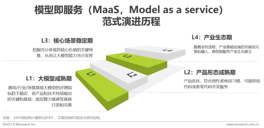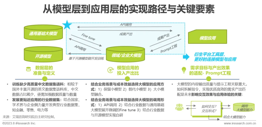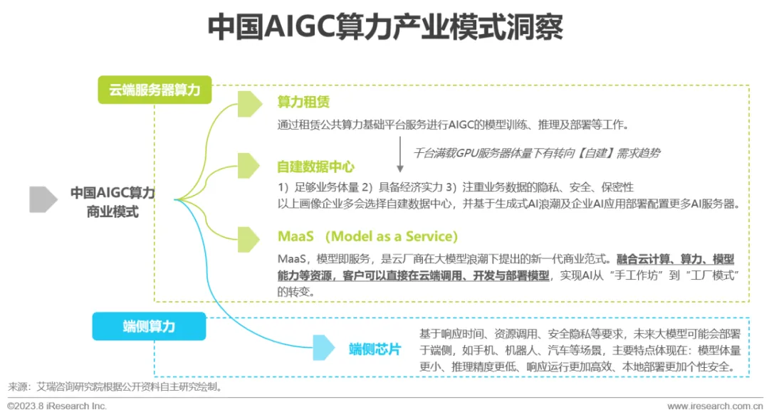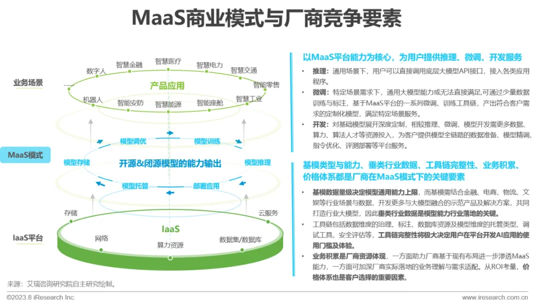 基于两大类基础架构衍生出各类大模型;多模态已成趋势预训练大模型按照模态可以分为文本、图像、视频、代码、音乐生成等多种,但从底层架构上都分属两类。Transformer是一种编解码模型框架,适用于处理文本、代码这类强连续性生成任务;Diffusion、GAN、NeRF等框架善于处理图像生成类任务。叠加文-图转换技术可以形成文生图模型。由单模态模型在实际训练时融合其他模态技术,可形成多模态、跨模态大模型,如GPT-4、文心一言、 Mid journey等,由于多模态模型可接受文本、图像等不同输入输出形式,对应用场景能够更广泛适配,着力发展多模态模型成为产研两界共同趋势。了解人工智能时代的“iOS”与“安卓”,闭源与开源市场将并存互补在以OpenAI为代表的闭源模型厂商开放对外技术服务后,开源模型厂商也在加紧发力,以Meta的Llama模型为代表陆续开源迭代,意图进一步实现生态层面的跑马圈地,2023年上半年LLM与数据集迎来开源季。大模型的开源可根据开源程度分为“可研究”与“可商用”级别。2023年2月,Meta发布了开源大模型LLM的第一个版本Llama,授予“可研究”用途。2023年7月进一步发布“可商用”的Llama2版本,虽然有日活超过7亿产品需额外申请、不能服务于其他模型调优等的商用限制,但海外很多中小企业已可用Llama2的模型来做私有化部署,基于Llama2开源模型训练出定制化的可控模型。由于Llama2基本不支持中文,对中国的大模型商用生态暂时不会产生实质性变化,中国仍需开发培育适配于中文数据土壤的开源生态。闭源LLM可为B端用户和C端消费者持续提供优质的模型开发及应用服务;开源LLM可从研究角度促进广大开发者和研究者的探索创新,从商用角度加速大模型的商业化进程与落地效果。未来,开源和闭源的LLM会并存和互补,为大模型发展共同创造出多元协作的繁荣生态。轻量级模型陆续开源,助力开源生态建设,千亿级模型暂以闭源路径开展AIGC开源社区的建设可以吸纳更多的开发者及拥有定义用户的主导权,以AI开源创新平台为杠杆,带动支撑底层AI芯片、智算中心及云服务等基础设施发展。从供给侧逻辑来看,大模型开源早期由高校和机构推动,如清华大学的ChatGLM-6B、复旦大学的MOSS,陆续有头部云厂商加入,如百度的文心系列与阿里的通义系列,共同为中国AIGC开源社区的建设“增砖添瓦”,以阿里云魔塔社区、百度云飞桨社区为代表的开源社区建设成果初现,而千亿级模型暂以闭源路径开展,凭借稳定、优质效、完整工具链等产品特点定位应用市场;从商业化路径来看,参考海外明星开源社区Hugging Face的商业模式,中国AI开源社区同样会先免费提供基础算力,为客户提供免费的社区体验、demo部署及测试,并进一步通过付费服务推送轻量级迁移的微调推理服务或深度开发的训练调优平台,提升模型产品性能,通过开源社区吸引开发者、企业客户完成更多部署应用资源的引流变现。大模型的落地将提速AI工业化生产,并充分释放AI产业潜在市场空间大模型类似于一个能力全面且突出的“完全体”,不仅通用性强,且能力相比小模型有较大提升。因此,用大模型做应用开发,可以采用“预训练+微调”开发范式,只需要针对具体任务,对大模型进行二次开发、微调甚至只是单纯以领域知识库做辅助,就可以快速赋能应用。相比独立分散的小模型开发,标准化、流程化程度更高,在开发效率和运维成本上都有较大改善,有效促进了AI的工业化生产。同时,模型能力的提升使得更多AI服务可以落地,有效扩展了AI的应用范围,这些共同促进AI供需两侧潜力释放。打造大模型商店,为下游提供低门槛、低成本的模型使用与开发支持MaaS(Model-as-a-Service),模型即服务,是指以云计算为基础,将大模型作为一项服务提供给用户使用的新业态。如今,MaaS模式已成为各家云巨头厂商发展第一战略优先级,把模型作为重要的生产元素,依托于既有IaaS设施与PaaS平台架构,为下游客户提供以大模型为核心的数据处理、特征工程、模型训练、模型调优、推理部署等服务。未来,顺应大模型开源趋势,MaaS服务商将着力打造大模型商店平台,发力大模型生态建设,纳入更多允许商用的开源模型,提升平台的基模类型及能力,并丰富工具链产品服务,通过业务积累、数据回流、模型迭代逐步形成壁垒,在拉高云服务营收天花板的同时进一步塑造厂商的核心竞争力。模型即服务(MaaS)构建新型AI基础设施,重构AI开发部署范式随着企业上云进程中智能化转型需求的逐步增多和传统行业领域数据的不断积累,AI应用开发过程中逐渐面临大量细分领域的深耕、非典型客户需求,对算法的通用性和延展性提出了较高要求。传统“小模型”范式的AI应用开发流程一般针对单一场景,独立完成模型选择-数据处理-模型优化-模型迭代等一系列开发环节。因此,AI应用在定制化需求、长尾需求下的开发效率较低,且模型精度、性能、可扩展性等指标质量也会受到影响。随着AI产业深入及智能化需求增加,AI在研发门槛及开发效率的问题日益凸显。“预训练大模型”应运而生,其将数据中蕴含的知识通过无监督或者自监督学习方式提取出来,存储在具有大量参数的神经网络模型中。AI应用开发流程转变为,调用通用流程-结合行业经验-解决实际问题。未来,大模型将成为AI产业的操作系统,其基础设施特性可为AI应用开发做好底座,将AI