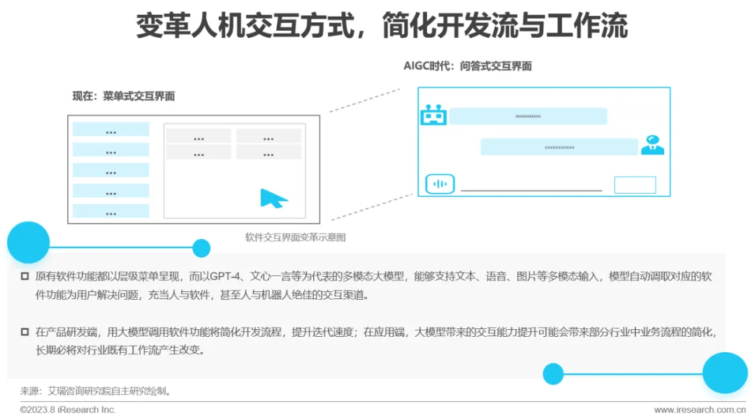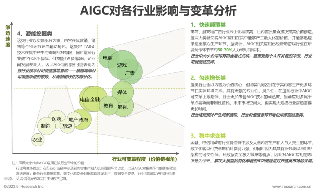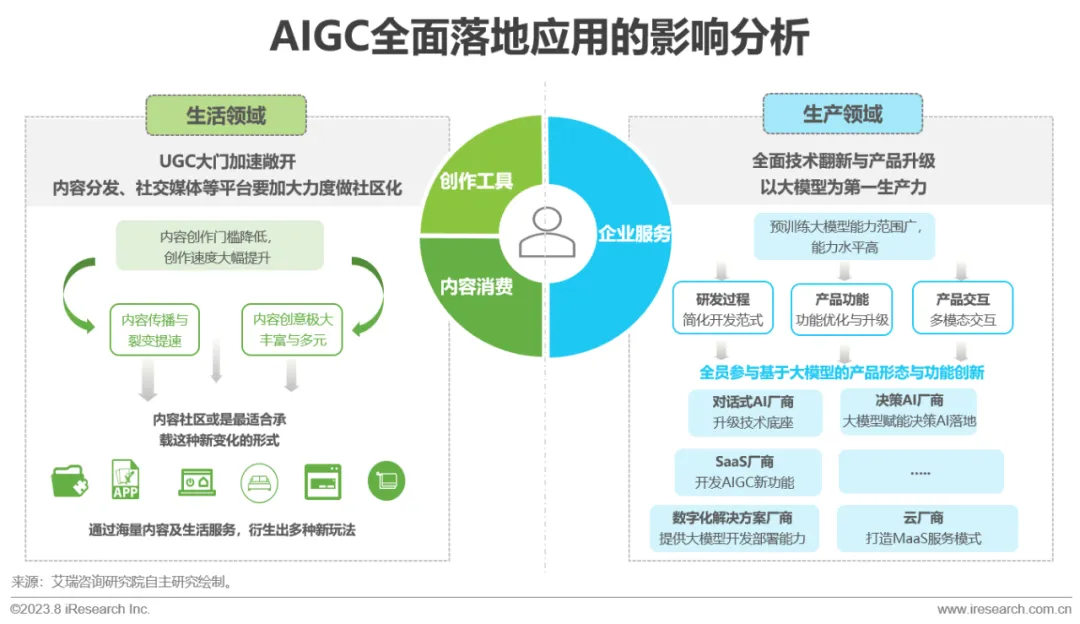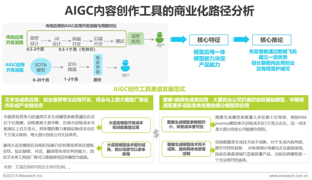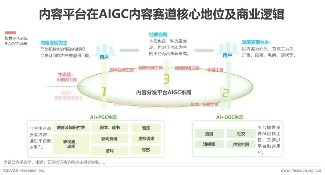 生活领域充分释放用户创新能力,生产领域全面革新交互体验和效率以大模型为标志,生成式AI是一次新的技术革命,同时还具有极强的普适性,能够对人类生产、生活的方方面面进行改造与升级。在生活领域,AIGC将通过进一步下放内容创作权,激发UGC创作热情,加速内容裂变。加之社区玩法在部分内容平台的良好盈利表现,内容消费领域从技术到商业模式的路径已全线打通,以社区形式,通过用户自发交流自主创作形成粘性,是各类平台的发力方向。在生产领域,大模型能从研发流程、产品能力和交互上全方位为企服软件带来提升,也充分开拓了新的服务场景,因此各类企业数字化厂商都将围绕大模型寻找自身优势空间与定位。线上化程度、数字化基础、行业内容占比等影响AIGC应用前景与渗透速度总体而言,AIGC主要影响内容创作与人机交互,因此价值链线上化程度越高,内容在价值链中占比越高,AIGC对其颠覆效应越明显;另一方面,行业自身的数据、知识、监管要求等特点也会深刻影响到AIGC技术的渗透速度。比如电商、游戏、广告、影视传媒等以内容生产为价值核心的行业,以及电商、金融等研发设计、营销等环节在行业价值链中地位较高的行业,能够快速看到AIGC应用对原有生产工具的替代和业务流程的变革。内容分发平台一端链接创作者,一端绑定大量用户,拥有最为完整的内容消费生态,也天然成为了AIGC内容消费的布局核心。原本,内容消费市场按照创作者和商业模式可大致分为PGC和UGC。PGC专业性强,以内容付费为主要盈利模式,需要快速大量推出新内容刺激用户购买,因此PGC平台的主要战略是前向打通内容制作环节,并为了提高用户粘性同步发展UGC;UGC内容相对生活化,本质是贩卖流量,需要将内容质量保持在可持续吸引用户注意力的水平。因此,两类平台均在积极布局面向UGC的AI创作工具。由于线上社交需求持续增长,社交业务也展现出超强的盈利能力,是内容分发平台变现的新方向,如网易云音乐2022年在社交娱乐板块收入已大大超出其音乐服务收入。各大内容平台也都在布局社群业务,盘活手中用户,其中应用到AIGC技术支撑的营销文案、电商图片甚至评论的自动生成中。此外,在各大内容、电商平台的后台普遍有大量精准推荐、智能客服等系统,平台也在逐步使用大模型替换和补充原AI技术栈,但这部分应用并不能直接产生内容消费,因而艾瑞将其归为AIGC企业服务赛道而非AIGC内容消费赛道。创作工具赛道:模型能力为核心,文、图发展路径将分化短期内模型—应用不分家,图像生成领域尚有模型自研机会与传统内容创作工具相比,AIGC内容创作工具的最大特点为“底层模型重、前端轻”,因此产品竞争的核心要素也从功能设计变成模型能力。在这种情况下,是否拥有自研SOTA模型将成为AIGC应用厂商的关键分水岭。基于基础大模型的研发投入、使用现有模型开发高质量应用的可行性这两个核心要素来看,文本类应用和图像类应用的发展路径差异明显:大语言模型成熟度高,自研壁垒高,直接基于现有模型开发应用更为现实;而图像生成模型成熟度低,自研成本可控,因此吸引更多创业者聚集。AIGC融入既有应用降本效果明显,营收增长主要依靠服务新场景