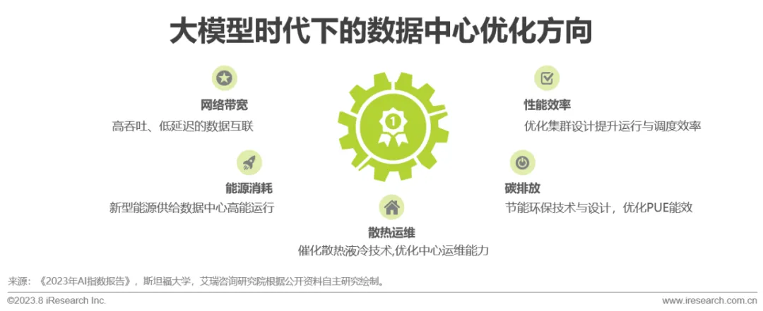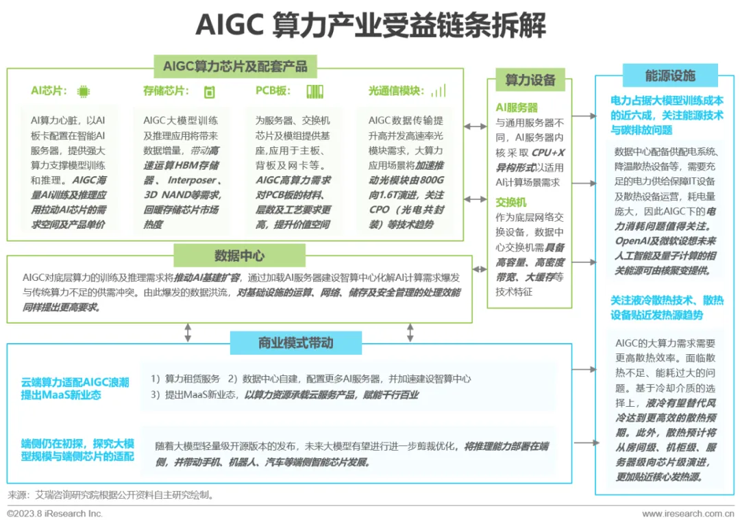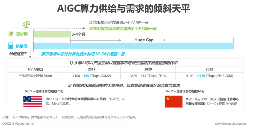 重点关注“芯片硬件、服务器、应用模式、能源散热”等算力模块算力支撑与模型需求存在gap,AIGC的大算力需求让供需结构进一步承压自2017年谷歌提出Transformer架构后,人工智能发展逐步迈入预训练大模型时代。2018年6月,OpenAI的GPT模型参数量已经达到1.17亿,模型参数量开始实现亿级基底的飞越发展,平均每3-4个月即呈现翻倍态势,由此带来训练算力需求也“水涨船高”。算力正在成为影响国家综合实力和经济发展的关键性要素。浪潮信息发布的相关报告表明,计算力指数平均每提高1个点,数字经济和GDP将分别增长千分之3.3和千分之1.8。面对算力层的供需结构矛盾,各国积极发展算力层基础设施建设。在计算力指数国家排名中,美国坐拥全球最多超大规模数据中心,以75分位列国家计算力指数排名第一,中国获得66分位列第二,随后为日本、德国、英国等国,算力建设已然成为国家高质量发展的战略级方针。2022年末,在OpenAI的GPT模型涌现能力后,AI产业迅速进入以大模型为技术支撑的AIGC时代,巨量训推算力需求让本就供需不平的算力产业结构进一步承压。目前中国各地正加快新一批数据中心与智算建设,持续优化算力资源,满足未来高速发展的大算力需求。智能算力资源或将更多承载于云服务产品,以MaaS模式服务千行百业过去数据中心以租赁与自建为主,算力需求方基于自身业务量级、财务预算情况、数据隐私要求等情况进行选择租赁或自建。在AIGC时代背景下,数据中心将配置更多AI服务器满足日益剧增的智能算力需求,云厂商更是提出MaaS(Model as a Service)模型即服务的商业模式,将云计算、智能算力、模型能力等资源做高度融合,客户可以直接在云端调用、开发与部署模型,更好适配于客户的个性化需求。未来,更多长尾企业的需求体量将拥抱MaaS商业模式。相较于云端算力发展,端侧大模型虽然发展较缓,仍是各家终端厂商发展的技术焦点,如从苹果招聘信息中可观测到其对“在端侧实现推理和加速大语言模型功能“的人才需求及产品规划。未来,随着大模型轻量级开源版本的发布,大模型有望进行进一步剪裁优化,将推理能力部署在端侧,并带动手机、机器人等端侧芯片发展。大模型时代下,数据中心将进一步优化网络带宽、能源消耗与散热运维等预训练大模型的训练推理需要巨量数据资源与高性能计算机的全天候高速运转,对数据中心的网络带宽、能源消耗与散热运维等能力提出更高要求。首先,网络是数据中心最为重要的组成部分,随着数据量与计算量的飞涨,数据中心需优化网络带宽,实现数据在节点内与节点间的高吞吐低延迟的传输与连接,并进一步优化计算集群的架构与设计,保证数据中心的高效利用率;其次,能源消耗与碳排放问题是数据中心亟需关注的重点问题。普通服务器的标准功耗一般在750~1200W,而AI模型运行时会产生更多的能耗,以CPU+AI芯片(搭载4卡/8卡)异构服务器为例,系统功耗一般会达到1600W~6500W。根据斯坦福大学发布的《2023年AI指数报告》数据显示,GPT-3模型训练耗费的电力可供一个美国家庭使用数百年,CO₂排放量也相当于一个家庭排放近百年;另一方面,基于大模型算力需求的高能耗运行,其热量释放呈现倍增态势。为了确保服务器能够长期处于适合的工作温度,数据中心将更注重系统设计和散热技术的发展应用。大模型散热需求加速由风冷到液冷的技术升级,进一步提升经济性、节能效果和散热效率等。散热也将更贴近发热源,由机柜级散热、服务器级到芯片级发展。目前,中国大力推进“东数西算” 工程,并发布《新型数据中心发展三年行动计划(2021-2023年)》等政策性文件,引导新型数据中心实现集约化、高密化、智能化建设,在AIGC时代下完成中国算力产业在规模、网络带宽、算力利用率、绿色能源使用率等方面的全方位提升。为服务于大模型的训推,AI芯片需进一步升级内存、带宽、互联等能力算力是评价AI芯片的核心要素,而除了运算次数外,芯片的性能衡量还需考虑运算精度。基于运算数据精度不同,算力可分为双精度算力(FP64)、单精度算力(FP32)、半精度算力(FP16)及整型算力(INT8、INT4)。数字位数越高,代表运算精度越高,可支持的运算复杂程度越高,以此适配更广泛的AI应用场景。为了适配大模型的训练及推理,AI芯片要求有更大的内存访问带宽并减少内存访问延迟,由此带动由GDDR到HBM的技术升级,另一方面需要更高的片间互联甚至片内互联能力以满足AI加速器访存、交换数据的需求。最后,大集群不等于大算力,在大规模集群部署下,集群训练会引入额外通信成本,节点数越多算力利用率越低,且单点故障影响全局运行。因此,同比增加GPU卡数或计算节点,不能线性提升算力收益,中国面临的单卡芯片性能差距将更难通过堆料等方式解决。英伟达能否延续强者恒强?中国何时迎来自主创新芯片曙光?作为AIGC产业的基建层,算力是AIGC生产力卡脖子的关键环节。对此,算力生产商纷纷发力,如AMD、英特尔等追赶型企业针对AIGC的产品新品动作频频。对标英伟达的Grace Hopper,AMD推出“CPU+GPU”双架构的Instinct MI 300进军AI训练端。英特尔即将在2025年发布Falcon Shores GPU,将其混合架构改为纯GPU解决方案。目前,国内大模型训练芯片仍以英伟达GPU为主,且英伟达作为首批训推部署框架成品及平台生态将进一步巩固其在生成式AI的优势地位,但国内客