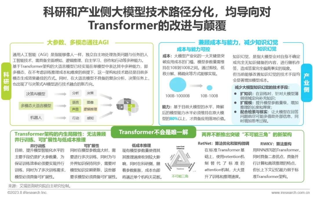 中短期基于Transformer算法和结构优化仍是主流,长期可能被替代学术界将通过扩大模型参数量、调整模型结构、局部算法优化等方式,进一步探索大模型的能力天花板,触碰AGI可能性;以各大企业为代表的产业侧,一方面从商业化落地角度追求更小模型参数下的高模型能力维持,以及解决大模型出现的知识幻觉问题,一方面也在积极研发探索新模型架构可能性,呈现“对外模型名称为厂商能力代号,但内含技术架构随时可能改变”的发展特征。产业与科研两侧的需求都已经暴露标准Transformer架构的巨大瓶颈,即“不可能三角”。各大机构与开发团队对Transformer架构的成功改进在快速推进,未来极有可能会出现具备推广价值的新Transformer架构。