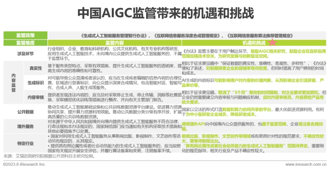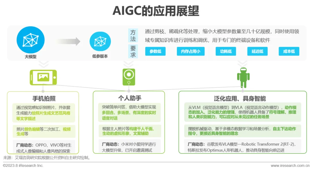 大模型低参版本的端侧应用,推动手机、机器人等物联网应用的升级进化大模型在端侧的应用,软硬一体的结合带来广阔的应用场景。端侧的应用首先需要将大模型进行剪枝、稀疏化等处理,降低参数到十亿级规模,同时根据场景进行专属知识的训练和微调以适配专门的终端设备和软件。这对终端设备的功耗、内存、延迟、成本等都提出了新的要求。具体来看,目前在手机拍照、多终端语音助手、机器人具身智能(指从第一人称视角出发,具备理解、推理、并与物理世界互动的智能系统)等方面表现出应用前景,推动物联网应用的升级与进化。2023年8月,华为推出鸿蒙4引入盘古AI大模型,在消费电子领域赋能;小米官宣13亿参数手机大模型;OPPO预计将与阿里云联合打造OPPO大模型基础设施。手机厂商纷纷入局轻量化手机大模型市场,以期为用户带来全方位智能化体验提升,也许不久将来大模型应用将成为用户体验变革换代的“新触点”。AI成为基础设施,部分基础工作被替代,社会人力结构和分配方式重塑技术的跃迁、生产效率的提升并不会自然带来社会整体福利水平的提升,相反往往以牺牲部分人的利益为前提,进而引发社会结构、分配方式的重塑。AIGC交互界面的用户友好性、大模型开源及API价格的降低、插件服务带来的应用生态繁荣等,都使得AI技术或将成为像水、电、网络一样的基础设施,渗透并改变千行万业。然而,大模型具有认知、分析、推理能力,不同于自动化浪潮下对蓝领的冲击,AIGC时代受AI影响最大的可能是初级专业人士和技术人员,即部分白领。据麦肯锡数据预测,到2045年左右,有50%的工作将被AI替代,比此前的估计加速了10年。与此同时,具有创造力、深度思考等高阶智力的人才,将享受到AIGC带来的效率优势,成为AI的驾驭者,相应的工作需求也会增加。智力要素重要性的提升、附加值的提高,都将推动社会资源和财富向顶尖人才和组织聚集,但社会是一个整体,生产效率的提升并不代表着购买力的提升,被替代的普通职工才是购买力的最大来源,为了维持供需平衡,分配制度需要重塑。如美国总统竞选人杨安泽提出向大企业征收增值税,并向公民发放补贴,以及OpenAI创始人Sam Altman提出的世界币均等分配等,都通过反思并调整现有的分配方式,以驱动社会向更美好的方向演进。鼓励AIGC研究,放宽内容容错率,强调AI生成标识,推动公开数据建设自AIGC逐渐应用以来,引发了知识幻觉、数据安全、个人隐私、道德伦理等诸多问题和讨论,新生的行业亟需监管措施的跟进和健康发展引导。2023年7月,网信办等七个部门正式发布了《生成式人工智能服务管理暂行办法》(以下简称《办法》),距离征求意见稿发布仅隔三个月,且监管要求更为宽松,反复强调了鼓励发展的态度。具体来看,《办法》主要规范公共服务环节,不包含有关专业机构的研发和应用环节,鼓励企业在自研自用范围加强技术攻关;其次,《办法》不强求生成内容的真实、准确性,放宽了容错率,对前期探索的企业带来一定利好,但同时也提高了用户辨别的时间和成本。同时,《办法》要求提供者对AI生成内容进行显著标识,有望从根本上杜绝AI生成内容难以辨别的问题,但也可能影响用户对内容的价值判断,对企业带来负面影响。最后,国家以立法的形式打造数据和算力协同共享的平台,最大化促进资源利用,有利于为中小型企业减负,降低研发成本。《办法》发布后,即引发了苹果应用商店对ChatGPT、讯飞星火等AIGC相关App的下架整改行动,行业整顿步伐进一步加速。