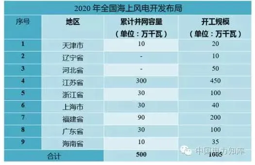 对于海上风电建设,规划的态度是“积极稳妥推进”:重点推动江苏、浙江、福建、广东等省的海上风电建设,到2020年四省海上风电开工建设规模均达到百万千瓦以上;积极推动天津、河北、上海、海南等省(市)的海上风电建设;探索性推进辽宁、山东、广西等省(区)的海上风电项目。到2020年,全国海上风电开工建设规模达到1000万千瓦,力争累计并网容量达到500万千瓦以上。