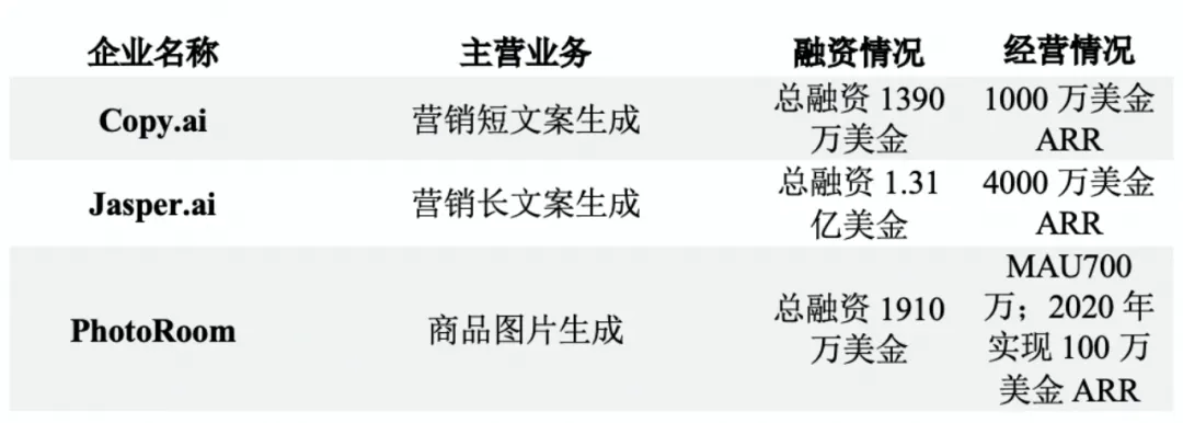 Jasper.ai与Copy.ai 都是基于GPT-3构建上层营销文案领域的应用。其中Jasper.ai调用GPT-3的API,专注于长文案生成,目前融资1.31亿美金,2年内实现了4000万美元的ARR,2022年预计9000万美金ARR;Photoroom是为二手货中小卖家及个人卖家生成宣传图片的工具,底层整合了Stable Diffusion开源模型,目前 PhotoRoom的 MAU 达到了 700 万,订阅用户则达到了几十万,每天处理的图片达到了 300 多万张,并且过去两年一直处于盈利状态。