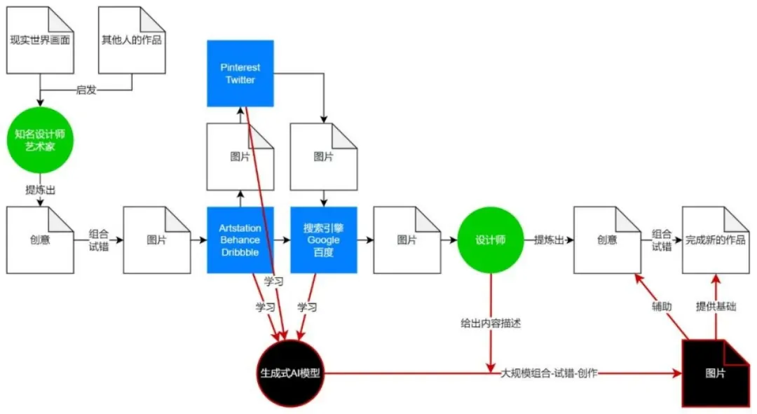 但我们可以看到的是,设计环节已经发生了变化。传统出图的流程是:接到需求——搜集参考——构思——出图——和甲方沟通修改。设计师理解需求之后,会通过一些图库网站比如Pinterest、Getty Images等网站找寻素材,然后从这些素材当中获得灵感,然后会尝试去组合、试错,反复打磨自己的作品。而现在AIGC替代了设计人员去付费购买、搜索引擎搜索素材、去组合成一件作品的过程,而且是在秒级时间内完成整个过程。