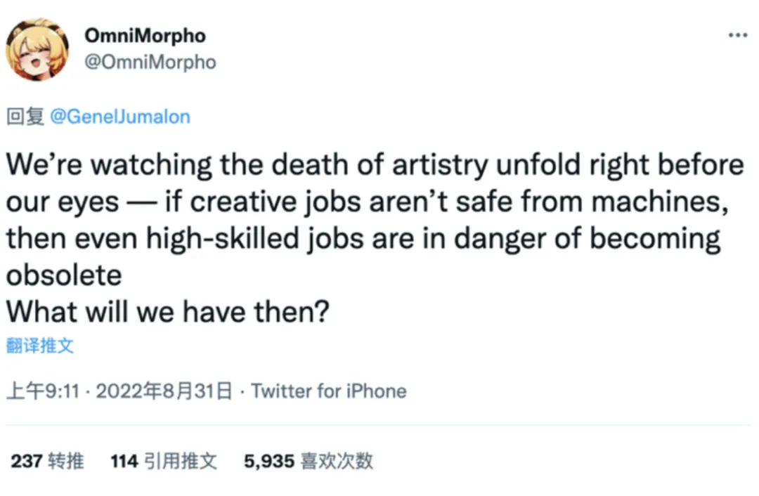 据了解,AI作画第一次进入大众视野是因为在美国科罗拉多州博览会的一项美术竞赛中,一幅通过AI自动生成的画作《Théâtre D'opéra Spatial》(太空歌剧院)获得了该竞赛数字艺术类别的一等奖,并在网上引起了热议。这是由一位游戏设计师通过Midjourney反复迭代生成的图片,随后不少艺术家开始在社交媒体上批评这位设计师,指责其剽窃并抱怨不公平待遇。