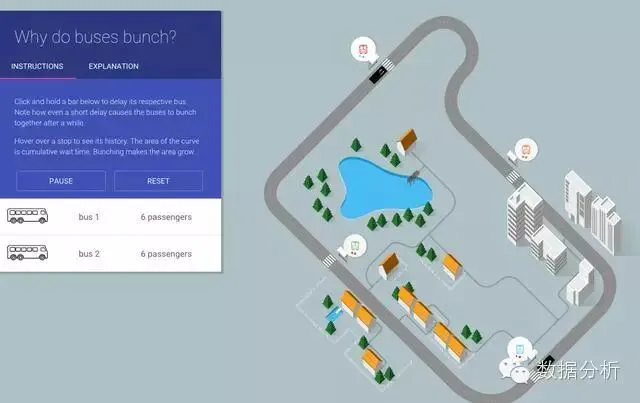 这里有一个关于复杂数据集的很好的例子,它看起来感觉像一个游戏。在这个例子里,Setosa网站为我们呈现了“巴士群”现象是如何发生的,即,当一辆巴士被延迟,就会导致多辆巴士在同一时间到站。