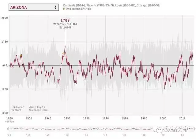 体育世界有着丰富的数据,但这些数据并不总是能有效地呈现(或者准确的说,对于这个问题)。然而,FiveThirtyEight网站做的特别好。在下面这个交互式可视化评级中,他们计算所谓“等级分” – 根据比赛结果对球队实力进行简单的衡量 – 在国家橄榄球联盟史上的每一场比赛。总共有超过30,000个评级。观众可以通过比较各个队伍的等级来了解每个队伍在数十年间的比赛表现。