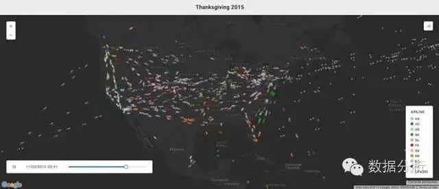 下面是将一段时间内在空中移动的物体进行可视化的好方法。这是由Google Trends驱动的项目,它跟踪感恩节前出发、到达和穿越美国的航班。可视化始于当天很早的时间,随着时间的推移,像播放电影一样显示在全国各地飞行中的航班。不需要显示时间外的任何数字,观众即可以看到当天哪段时间是国际航班、国内航班以及往返于全国各地不同枢纽的航班的热门时间。