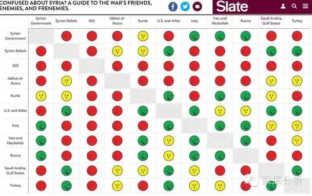 许多不同的团体之间的关系可能很难理解 – 尤其是当有11个这样的团体存在的时候,这些团体之间有的结盟,有的敌对,反之亦然。这让人难以理解。但是,Slate网站通过表格的形式和熟悉的视觉效果和色彩,将这些数据简化为一种简单的、易于理解和互动的形式。
