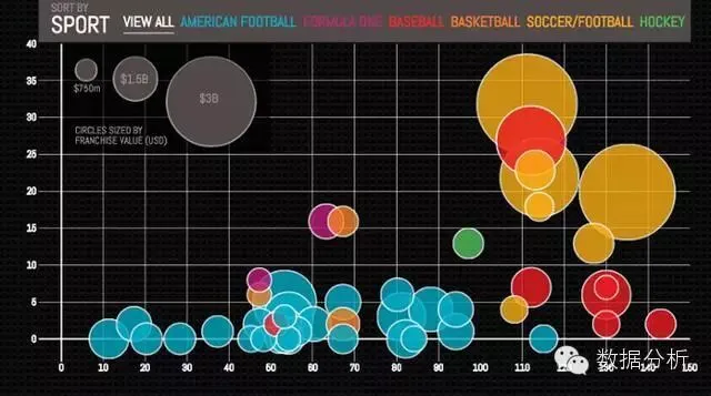 这是通过叠加数据来讲述深层故事的一个例子。这个交互由Column Five设计,受福布斯“2014年最具价值的运动队50强”名单得到的启发。但是它不仅将列表可视化,用户还可以通过它看到每支队伍参赛的时间以及夺得总冠军的数量。这为各队的历史和成功提供了更全面的看法。