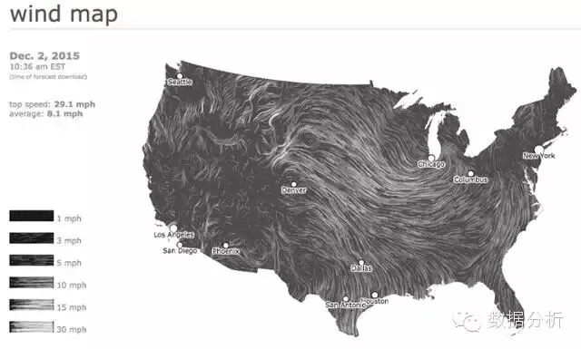 下面是是个类似感恩节航班的可视化图,除了图中显示的时刻,它还能实时显示美国本土的风速和风向。它是直观设计的一个很好的案例:风速用线条移动的快慢来表示,方向通过线条移动的路径来表示。它会即时显示美国风向的总体趋势,无需任何数字,除非你在地图上点击鼠标。另外,使用时设定最多两个变量会使它更容易操作。