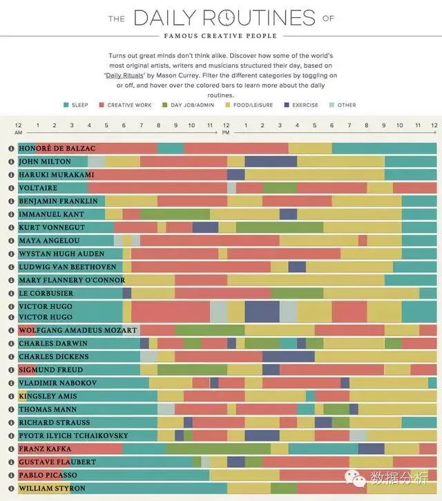这个数据的可视化图是用奇特的想法描绘一个简单的概念。这个表格利用Mason Currey的《日常惯例》一书中的信息展示了那些著名的创意人士的日程安排,解读其时间和活动安排。这不仅是一个操作数据的例子(因为你可以通过单独的活动来浏览日程安排),也是一个品牌宣传的佳作。