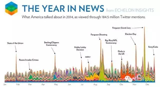 最好的数据可视化方式,就是用直观和美丽的方式传达信息。Echelon Insights致力于这一方式,即将2014年Twitter上最受关注的新闻进行可视化。1亿8450万条推文是什么样子?如图所示的艺术品。