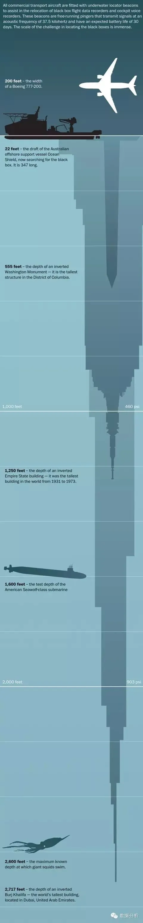 当你想强调规模的时候,静态数据可视化是表达你的观点的极佳方式。下面这张来自《华盛顿邮报》的信息图长得令人难以置信…这是故意的。他们在图中展示了一架飞机可以探测到的深海信号是多么的深,通过比较飞机的探测深度与高层建筑、已知哺乳动物的最大深度、泰坦尼克号沉船的深度等。这是简单的视觉效果和颜色梯度的极佳使用方式。最后,将数据添加到新闻报道(文中为失踪的马航)是提供背景的好方式。