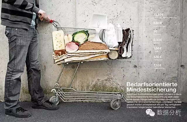 不是所有的数据可视化都需要用动画的形式来表达。当现实世界的数据通过现实生活中的例子进行可视化,结果会令人惊叹。设计师Marion Luttenberger把包含在Kontakladen慈善年报中的数据以一种独特的方法表现出来。该组织为奥地利的吸毒者提供支持,所以Luttenberger的使命就是通过真实的视觉来宣传。例如,这辆购物车形象的表现了受助者每一天可以负担得起多少生活必需品。