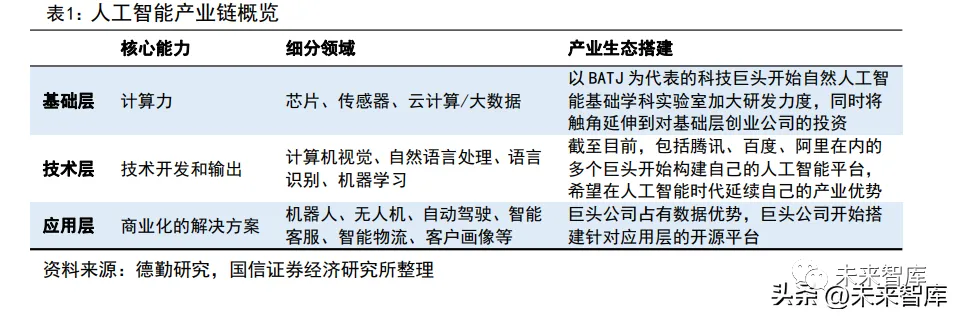 总体来看,人工智能产业链可分为基础支撑层、技术层和应用层。基础层提供算力,主要包含人工智能芯片、传感器、大数据及云计算。其中,芯片具有极高的技术门槛,且生态搭建已基本成型。目前该层级的主要布局玩家为Nvidia、AMD、英特尔等在内的国际科技巨头,国内在基础层的布局和实力均相对薄弱。技术层主要解决具体类别问题,这一层级主要依托运算平台和数据资源进行海量识别训练和机器学习建模,开发面向不同领域的应用技术,包括语音识别、自然语言处理、计算机视觉和机器学习技术等。科技巨头谷歌、IBM、亚马逊、苹果、阿里巴巴、百度都在该层级深度布局,并涌现了如商汤科技、旷世科技、科大讯飞等诸多独角兽公司。应用层主要解决场景落地问题,利用AI 技术针对行业提供产品、服务和解决方案,其核心是商业化。得益于人工智能的全球开源社区,应用层的进入门槛相对较低,但也是商业价值最大的环节(典型如算法推动在抖音、快手等应用端落地)。