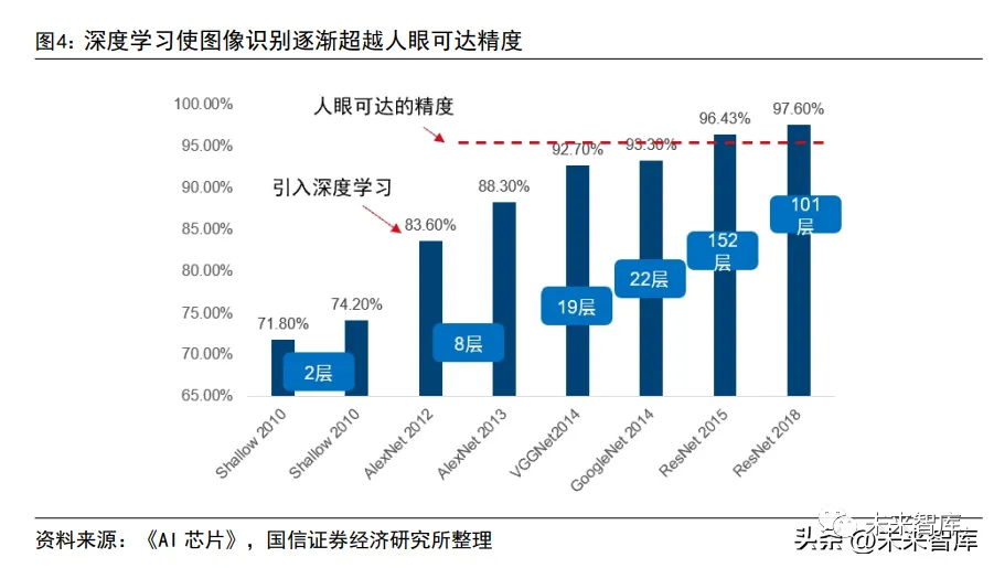 兴起:2006 年,Hinton 提出了神经网络 DeepLearning 算法,将人类从复杂的算法归纳中解放了出来,使人工智能再一次聚焦了学术界和产业界的目光。从底层算法来讲,深度学习算法弥补了传统 BP 神经网络的缺陷:1)多隐层的人工神经网络具有优异的特征学习能力,从而有利于可视化或分类;2)传统人工神经网络的训练难度可以通过“逐层初始化”来克服。通俗来讲,本轮算法的革命性进步在于:不需要人工去提取规则特征,机器通过海量数据,即可自动实现规则的特征提取,将最复杂的“算法归纳”留给机器去完成。数据显示,自2012年在图像识别领域引入深度学习算法以来,图像识别的错误率显著降低。并通过深度学习训练层数的增长及优化,在 2015 年通过 ResNet 模型使图像识别的精度超过了人眼可达的精度。