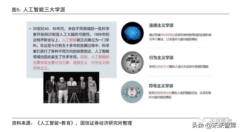 兴起:1956 年达特茅斯会议开启了人工智能的元年,仅在定理层次等证明了AI商用的可能性,实际应用还十分有限。1956 年,以约翰·麦卡锡、马文·明斯基、克劳德·香农等为代表的科学家们在达特茅斯组织了一场为期两个月的人工智能夏季研讨会,探讨如何通过机器模拟人类学习或人类智能的其他特征。本次会议结束后,很多国家政府、研究机构、军方等都开始投资人工智能,掀起了第一波人工智能热潮。在第一波 AI 的浪潮中,占据主导地位的思想是逻辑主义,即通过引入符号方法进行语义处理、将待研究和解决的问题转化为可以用计算机处理的符号,运用逻辑公理进行解答,从而实现人机互动。第一波人工智能浪潮的总体成就有限,仅在定理证明等特定领域取得了成功。受制于计算机性能及可获取的数据量,当时的人工智能只能完成玩具式的简单任务,在语音、图像识别及想起游戏等看似简单的任务上,进展都十分有限。