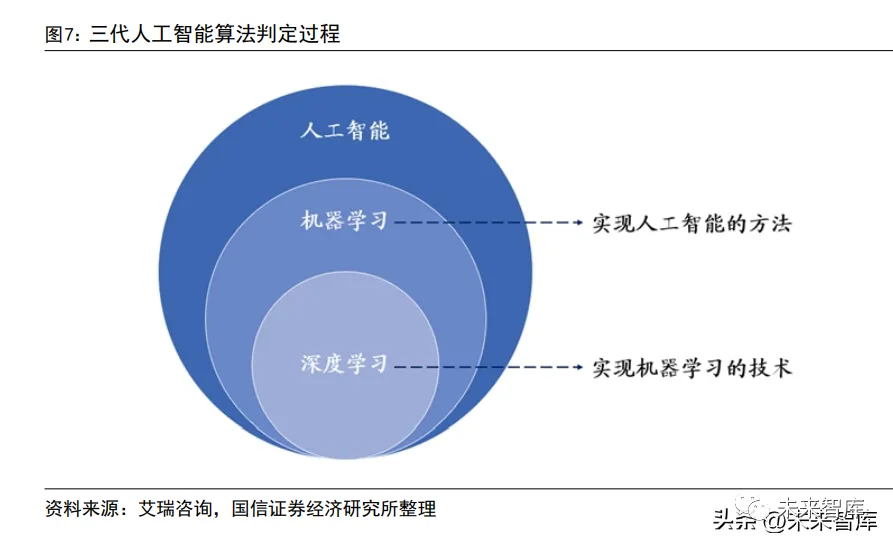深度学习与传统的机器学习最主要的区别在于:随着数据规模的增加,其判断准确度也在不断增长。判断准确度的提升,使人工智能技术可大规模应用于语音识别、图像识别等多个领域。2006 年,Hinton 提出深度学习算法,该算法与传统的机器学习算法最大的区别在于随着数据规模的增加,算法计算准确率也不断增长。当数据很少时,深度学习算法的性能并不突出,随着数据量的增加,其优越性得以体现。传统机器学习算法,在拟合度达到某一特定值后,再增加数据量,其拟合度不再提升;深度学习算法拟合准确度随着数据量及神经网络层数的增加而提升。例如,在引入深度学习之前,语音识别的准确率连续三年稳定在 76.4%,引入该算法后,其准确率逐年递增,2017 年已达94.5%。如判断某幅图片是否为猴子,深度学习算法的执行过程如下:人为将海量带有标签的图像数据到计算机中,无需进行任何特征提取或规则设定,算法自动根据输入图像的特征归纳出判定规则,并泛化至后续判断过程中。