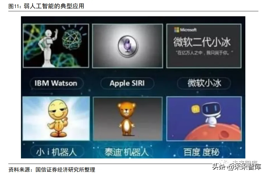 当前人工智能尚属于“弱人工智能”阶段。按照人工智能的执行深度,我们将人工智能的判定层次分为计算智能、感知智能和认知智能三个层次:1)计算智能:神经网络和遗传算法的出现,使机器能够高效、快速地处理海量数据,目前该技术的应用已相当成熟;2)感知智能:技术已相对成熟,典型应用语音识别及人脸识别,准确率分别超过 98%和 99%;3)认知智能:还有较大提升空间,典型应用包括机器翻译和计算机视觉认知,这两项技术与人力还有较大差距。通过以上对三个层级的分析,我们判断:人工智能技术尚不具备完全“认知”能力,处于垂直领域的应用投入商用、自主认知尚待攻克的“弱人工智能”阶段。