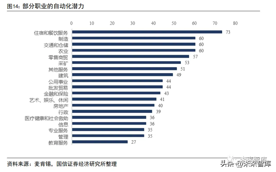 弱人工智能在特定领域的表现均超过人类,多种劳动密集型工作均具有较强自动化潜力。2017 年 10 月,AlphaGo 的升级版本实现了不通过向人类学习,只通过概率计算和自学自练就达成自我超越、战胜李世石的初代AlphaGo。由IBM开发人工智能 Waston,使用机器学习来分析和解读海量医疗数据和文献,检查患者数据做出治疗决定,印度班加罗尔研究表明,Waston 与医生在提供肺癌、结肠癌和直肠癌治疗建议方面一致性比例分别高达 96%、81%和93%。微软公司的人工智能虚拟机器人小冰,学习了 20 世纪 20 年代以来 519 位诗人的现代诗,自2017年2月起,“小冰”在天涯、豆瓣、贴吧、简书四个平台上使用了27 个化名发表的诗歌作品,几乎没有被发现是机器所作。不仅如此,人工智能在交通、教育、金融领域也展示出了巨大的应用前景。与人类相比,人工智能在数据存储、调用、分析处理方面的强大能力,以及在特定危险情境下的生存能力,都有望为人类生活带来巨大颠覆。麦肯锡报告表明,多种人力劳动密集、机械类工作都具有较强的自动化潜力,住宿和餐饮服务、制造、交通和仓储等职业自动化潜力巨大。