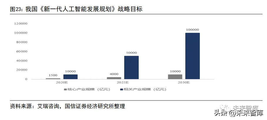 《新一代人工智能发展规划》提出了“三步走”战略目标,加速AI 再各行业渗透落地。第一步,到 2020 年,人工智能总体技术和应用与世界先进水平同步,人工智能产业成为新的重要经济增长点,核心产业规模超过1500 亿元,带动相关产业规模超过 1 万亿元;第二步,到 2025 年,新一代人工智能在智能制造、智能医疗、智慧城市、智能农业、国防建设等领域得到广泛应用,核心产业规模超过 4000 亿元,相关产业规模超过 5 万亿元;第三步,到2030 年,人工智能理论、技术与应用总体达到世界领先水平,形成涵盖核心技术、关键系统、支撑平台和智能应用的完备产业链和高端产业群,人工智能核心产业规模超过1万亿元,带动相关产业规模超过 10 万亿元。