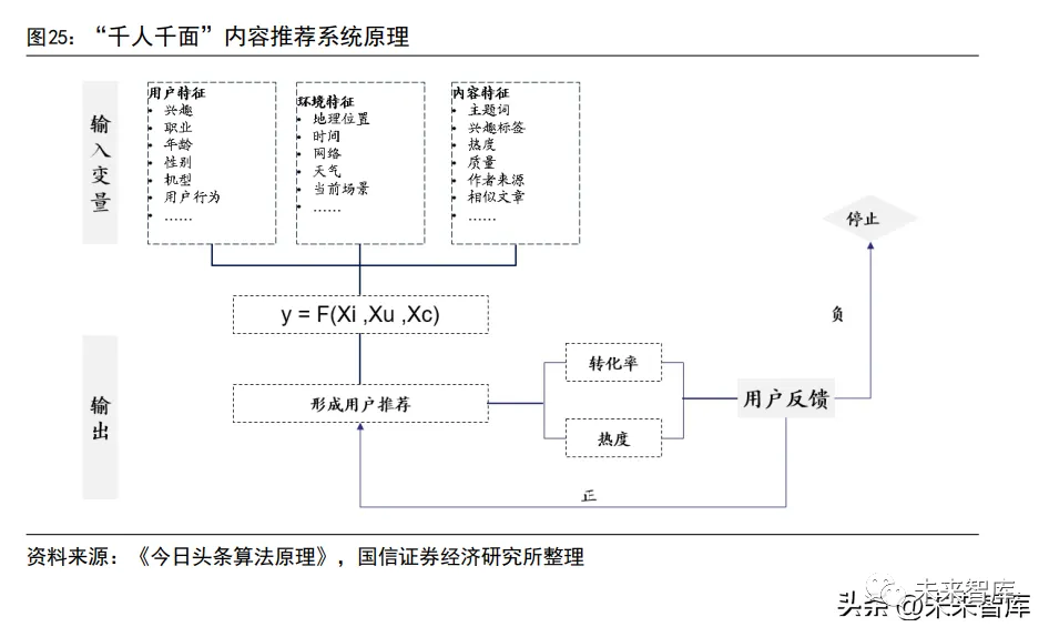技术解读:“千人千面”的推荐系统本质上是一个由AI 技术驱动的拟合函数,输入变量包括用户特征、环境特征和内容特征,输出变量为推荐结果。参与运算的参数包括:1)用户特征:包括兴趣、职业、年龄、性别、机型、用户反馈行为等;2)环境特征:地理位置、时间、网络、天气、当前场景(工作、地铁等);3)内容特征:主题词、兴趣标签、热度、质量等。结合三方面的信息,模型会运算出一个预估,即推测推荐内容在这一场景下对这一用户是否合适。然后对小批量相同标签的用户进行实时推荐。如果用户反馈(转化率、热度)达到设定标准,则将此内容进行大规模的推荐;如果用户反馈低于设定标准,则停止推荐。依靠该推荐系统,使平台长尾内容实现了有效的分发和触达。