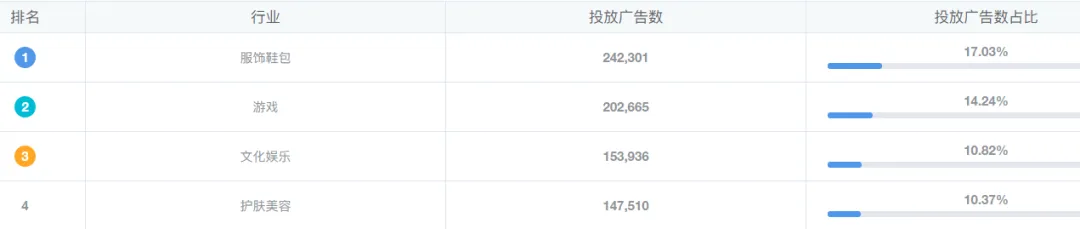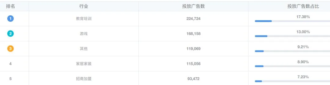 | 排名 | 行业 | 投放广告数 | 投放广告数占比 |