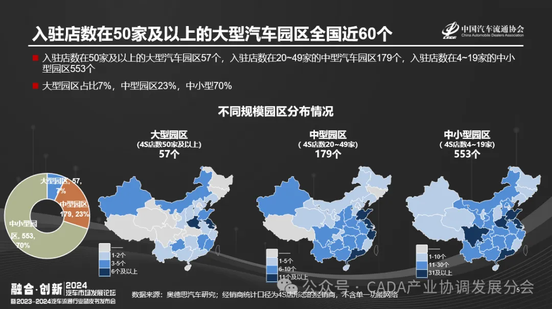 根据奥德思研究数据显示,在全国范围内,有789个汽车园区汇聚了4家及以上的4S店。目前,全国范围内大型汽车园区,即入驻店数达到50家及以上的,共有57个;而入驻店数介于20至49家的中型汽车园区则有179个;另外,入驻店数在4至19家的中小型园区数量为553个。